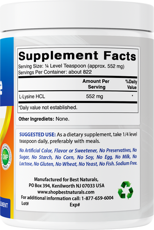 {"id":4673131315337,"title":"Best Naturals L-Lysine 1 Lb Powder","handle":"best-naturals-l-lysine-powder-1-lb","description":"\u003cul\u003e\n\u003cli style=\"font-weight: 400;\"\u003e\u003cspan style=\"font-weight: 400;\"\u003e3rd Party Lab Tested for Purity \u0026amp; Quality.\u003c\/span\u003e\u003c\/li\u003e\n\u003cli style=\"font-weight: 400;\"\u003e\n\u003cspan style=\"font-weight: 400;\"\u003e¼ Level Teaspoon\u003c\/span\u003e\u003cspan style=\"font-weight: 400;\"\u003e (552 mg) of L-Lysine HCL per Serving, 822 Servings per bottle\u003c\/span\u003e\u003cspan style=\"font-weight: 400;\"\u003e.\u003c\/span\u003e\n\u003c\/li\u003e\n\u003cli style=\"font-weight: 400;\"\u003e\u003cspan style=\"font-weight: 400;\"\u003eNon-GMO \u0026amp; Gluten-Free.\u003c\/span\u003e\u003c\/li\u003e\n\u003cli style=\"font-weight: 400;\"\u003e\u003cspan style=\"font-weight: 400;\"\u003eProudly Made in USA, GMP Compliant, FDA Registered Facility.\u003c\/span\u003e\u003c\/li\u003e\n\u003cli style=\"font-weight: 400;\"\u003e\u003cspan style=\"font-weight: 400;\"\u003eNo Artificial Color, Flavor, or Sweetener, No Preservatives, No Sugar, No Milk, No Corn, No Soy, No Egg, No Lactose, No Gluten, No Wheat, No Yeast, No Fish. Sodium Free.\u003c\/span\u003e\u003c\/li\u003e\n\u003c\/ul\u003e","published_at":"2020-03-14T09:31:07-04:00","created_at":"2020-03-14T09:59:16-04:00","vendor":"shopbestnaturals.com","type":"","tags":["Supplements"],"price":1399,"price_min":1399,"price_max":1399,"available":true,"price_varies":false,"compare_at_price":2199,"compare_at_price_min":2199,"compare_at_price_max":2199,"compare_at_price_varies":false,"variants":[{"id":32763365097609,"title":"Default Title","option1":"Default Title","option2":null,"option3":null,"sku":"817716014579","requires_shipping":true,"taxable":false,"featured_image":null,"available":true,"name":"Best Naturals L-Lysine 1 Lb Powder","public_title":null,"options":["Default Title"],"price":1399,"weight":508,"compare_at_price":2199,"inventory_management":"shopify","barcode":"817716014579","requires_selling_plan":false,"selling_plan_allocations":[]}],"images":["\/\/shopbestnaturals.com\/cdn\/shop\/products\/Image-1_cc32641c-dca8-48cb-b0c9-e212cf03b952.jpg?v=1749676147","\/\/shopbestnaturals.com\/cdn\/shop\/files\/Image-4_1be2fd73-9778-4e81-b5f8-a82aa6dcaa38.jpg?v=1756142445","\/\/shopbestnaturals.com\/cdn\/shop\/files\/Image-5_485da1fe-5d86-4ea1-90f5-b1308e43ce20.jpg?v=1756142445","\/\/shopbestnaturals.com\/cdn\/shop\/files\/Image-6_0d60f365-8df4-4441-8be7-6894d66b5fbe.jpg?v=1756142445","\/\/shopbestnaturals.com\/cdn\/shop\/files\/Image-7_6fac5ee7-93dd-4d24-9d26-58468b545a95.jpg?v=1756142445","\/\/shopbestnaturals.com\/cdn\/shop\/files\/Image-2_6f5ad0fb-821b-4b82-920a-2e100391cb72.png?v=1756142445","\/\/shopbestnaturals.com\/cdn\/shop\/files\/Image-3_669e6e75-dc5c-43ad-94d0-c9a82393bdbc.png?v=1756142445"],"featured_image":"\/\/shopbestnaturals.com\/cdn\/shop\/products\/Image-1_cc32641c-dca8-48cb-b0c9-e212cf03b952.jpg?v=1749676147","options":["Title"],"media":[{"alt":"Best Naturals L-Lysine Powder 1 Lb - shopbestnaturals.com","id":12135374880929,"position":1,"preview_image":{"aspect_ratio":0.75,"height":4000,"width":3000,"src":"\/\/shopbestnaturals.com\/cdn\/shop\/products\/Image-1_cc32641c-dca8-48cb-b0c9-e212cf03b952.jpg?v=1749676147"},"aspect_ratio":0.75,"height":4000,"media_type":"image","src":"\/\/shopbestnaturals.com\/cdn\/shop\/products\/Image-1_cc32641c-dca8-48cb-b0c9-e212cf03b952.jpg?v=1749676147","width":3000},{"alt":null,"id":37655812112601,"position":2,"preview_image":{"aspect_ratio":1.0,"height":1500,"width":1500,"src":"\/\/shopbestnaturals.com\/cdn\/shop\/files\/Image-4_1be2fd73-9778-4e81-b5f8-a82aa6dcaa38.jpg?v=1756142445"},"aspect_ratio":1.0,"height":1500,"media_type":"image","src":"\/\/shopbestnaturals.com\/cdn\/shop\/files\/Image-4_1be2fd73-9778-4e81-b5f8-a82aa6dcaa38.jpg?v=1756142445","width":1500},{"alt":null,"id":37655812145369,"position":3,"preview_image":{"aspect_ratio":1.0,"height":1500,"width":1500,"src":"\/\/shopbestnaturals.com\/cdn\/shop\/files\/Image-5_485da1fe-5d86-4ea1-90f5-b1308e43ce20.jpg?v=1756142445"},"aspect_ratio":1.0,"height":1500,"media_type":"image","src":"\/\/shopbestnaturals.com\/cdn\/shop\/files\/Image-5_485da1fe-5d86-4ea1-90f5-b1308e43ce20.jpg?v=1756142445","width":1500},{"alt":null,"id":37655812178137,"position":4,"preview_image":{"aspect_ratio":1.0,"height":1500,"width":1500,"src":"\/\/shopbestnaturals.com\/cdn\/shop\/files\/Image-6_0d60f365-8df4-4441-8be7-6894d66b5fbe.jpg?v=1756142445"},"aspect_ratio":1.0,"height":1500,"media_type":"image","src":"\/\/shopbestnaturals.com\/cdn\/shop\/files\/Image-6_0d60f365-8df4-4441-8be7-6894d66b5fbe.jpg?v=1756142445","width":1500},{"alt":null,"id":37655812210905,"position":5,"preview_image":{"aspect_ratio":1.0,"height":1500,"width":1500,"src":"\/\/shopbestnaturals.com\/cdn\/shop\/files\/Image-7_6fac5ee7-93dd-4d24-9d26-58468b545a95.jpg?v=1756142445"},"aspect_ratio":1.0,"height":1500,"media_type":"image","src":"\/\/shopbestnaturals.com\/cdn\/shop\/files\/Image-7_6fac5ee7-93dd-4d24-9d26-58468b545a95.jpg?v=1756142445","width":1500},{"alt":null,"id":37655812243673,"position":6,"preview_image":{"aspect_ratio":0.668,"height":1500,"width":1002,"src":"\/\/shopbestnaturals.com\/cdn\/shop\/files\/Image-2_6f5ad0fb-821b-4b82-920a-2e100391cb72.png?v=1756142445"},"aspect_ratio":0.668,"height":1500,"media_type":"image","src":"\/\/shopbestnaturals.com\/cdn\/shop\/files\/Image-2_6f5ad0fb-821b-4b82-920a-2e100391cb72.png?v=1756142445","width":1002},{"alt":null,"id":37655812276441,"position":7,"preview_image":{"aspect_ratio":0.668,"height":1500,"width":1002,"src":"\/\/shopbestnaturals.com\/cdn\/shop\/files\/Image-3_669e6e75-dc5c-43ad-94d0-c9a82393bdbc.png?v=1756142445"},"aspect_ratio":0.668,"height":1500,"media_type":"image","src":"\/\/shopbestnaturals.com\/cdn\/shop\/files\/Image-3_669e6e75-dc5c-43ad-94d0-c9a82393bdbc.png?v=1756142445","width":1002}],"requires_selling_plan":false,"selling_plan_groups":[],