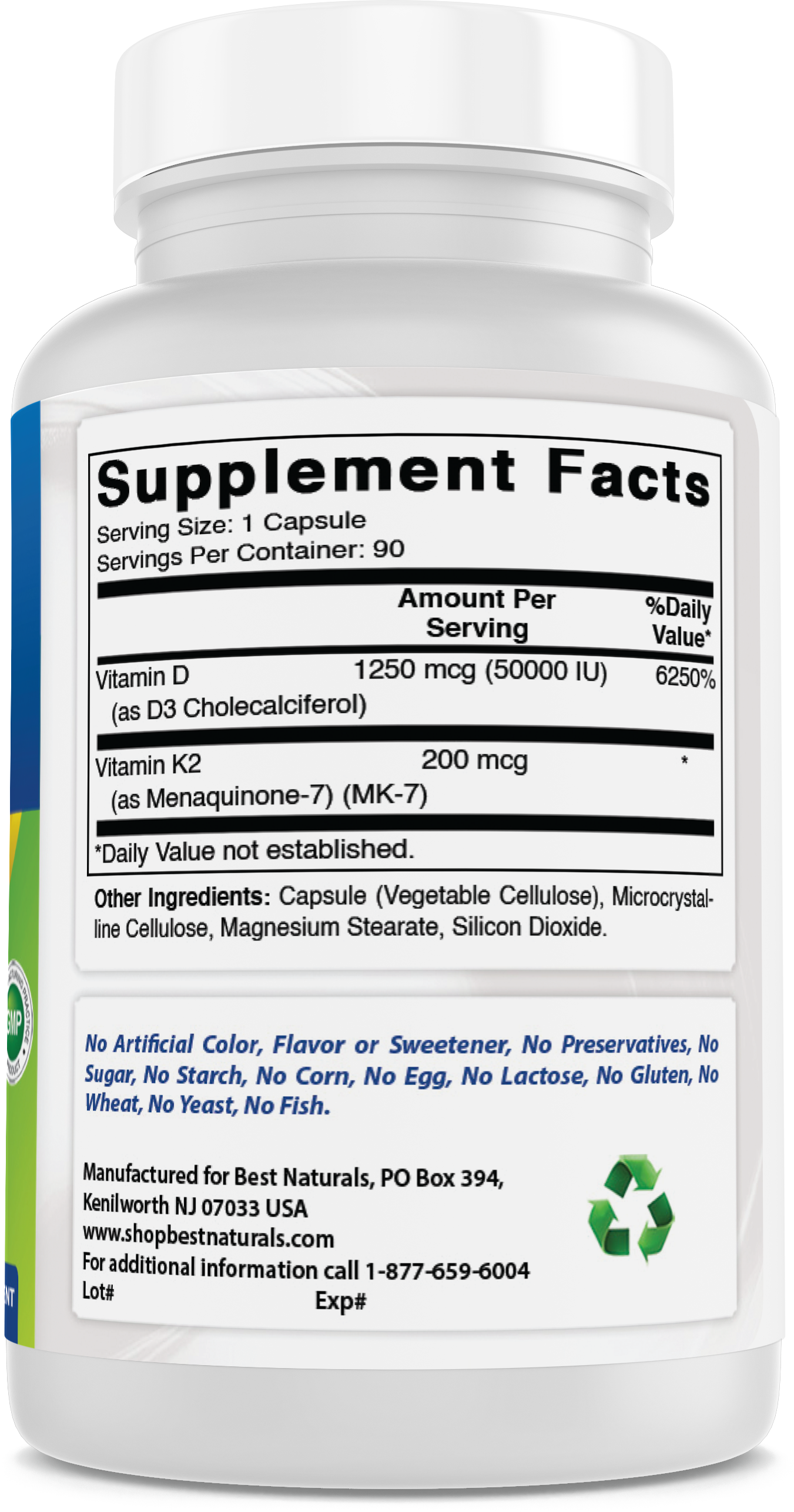 Best Naturals Vitamin D3 + MK-7 combines a high potency dose of 50,000 IU Vitamin D3 with 200 mcg of Vitamin K2 (MK-7) in a vegetarian capsule. Each bottle contains 90 capsules, with one capsule per serving. Designed for those who need a strong supplement, this formula is made in a GMP-registered facility, is non-GMO, and is free of gluten and common allergens.
